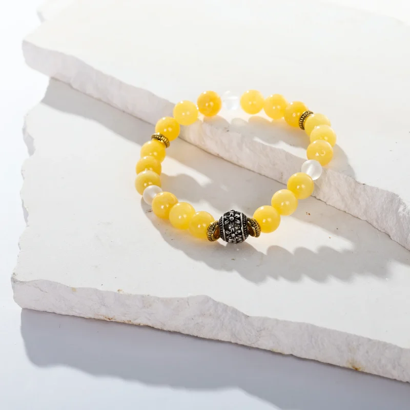 This bracelet features polished stone beads in a warm golden yellow colour, complemented by frosted translucent accent beads and antique silver tone decorative spacers that add texture and depth to the design. A detailed ornamental centre bead creates a refined focal point, balancing brightness with classic character. The bracelet is strung on a durable elastic band, allowing for comfortable wear and easy slip on styling.