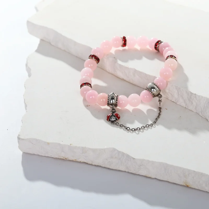 This bracelet features soft pink polished beads paired with deep red rhinestone spacers that add contrast and subtle sparkle throughout the design. Silver tone accent beads and a delicate chain detail connect to a charming ladybug pendant, creating a playful focal point while maintaining an elegant and balanced look. Strung on a durable elastic band, the bracelet offers comfortable wear and easy slip on styling.