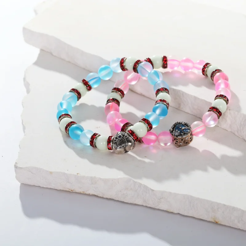 This bracelet set features frosted glass beads in soft sky blue and blush pink tones, beautifully accented with luminous beads, six on the sky blue bracelet and five on the blush pink bracelet. Red rhinestone spacers add a vibrant touch of contrast and sparkle, while decorative silver tone centre charms create distinctive focal points, blending playful colour with subtle celestial inspired detail.