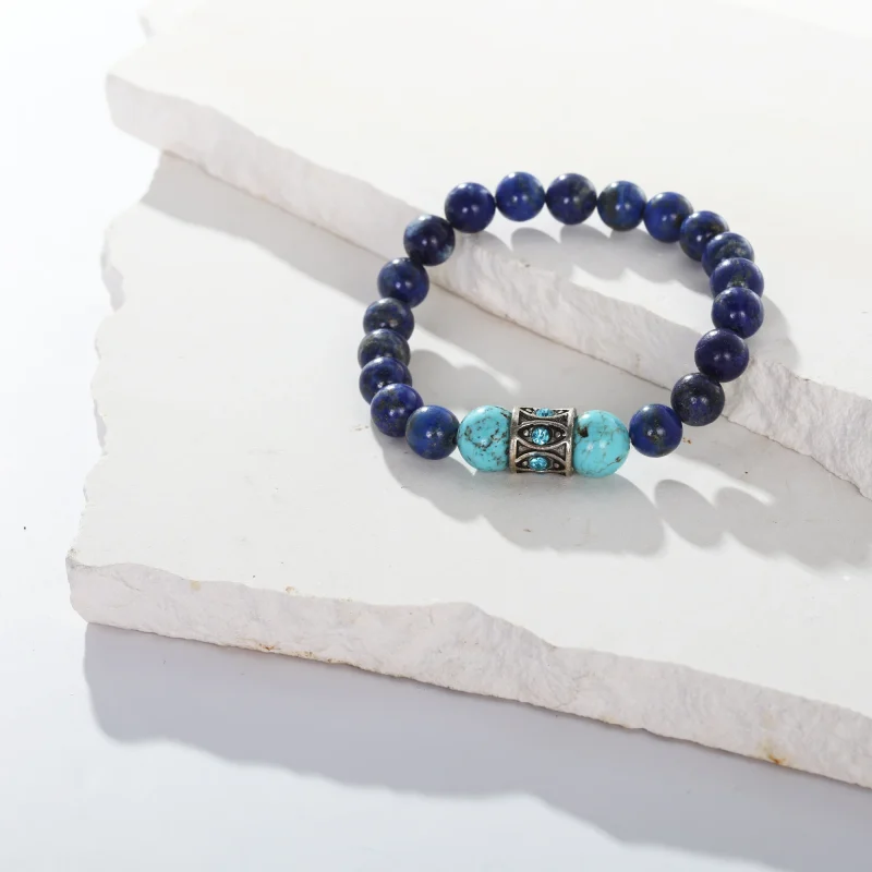 This bracelet features deep navy blue natural stone beads paired with vibrant turquoise coloured accent beads that create a striking ocean inspired contrast. The detailed antique silver centre bead, decorated with turquoise toned stones, adds texture and character while enhancing the bracelet’s refined yet adventurous aesthetic. The rich blue tones combined with bright turquoise elements evoke the meeting of deep waters and coastal skies.