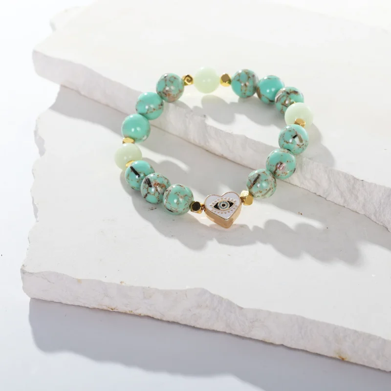 This bracelet features polished turquoise toned beads with natural marbled detailing, paired with three soft luminous pale green accent beads and gold tone spacers that add warmth and contrast. A heart shaped charm with an engraved protective eye creates a meaningful focal point, symbolizing protection, clarity, and positive energy. The bracelet is strung on a durable elastic band for comfortable wear and easy slip on styling.
